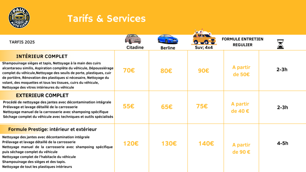 - Supplément poils d’animaux, sable, voitures très sales : 10€